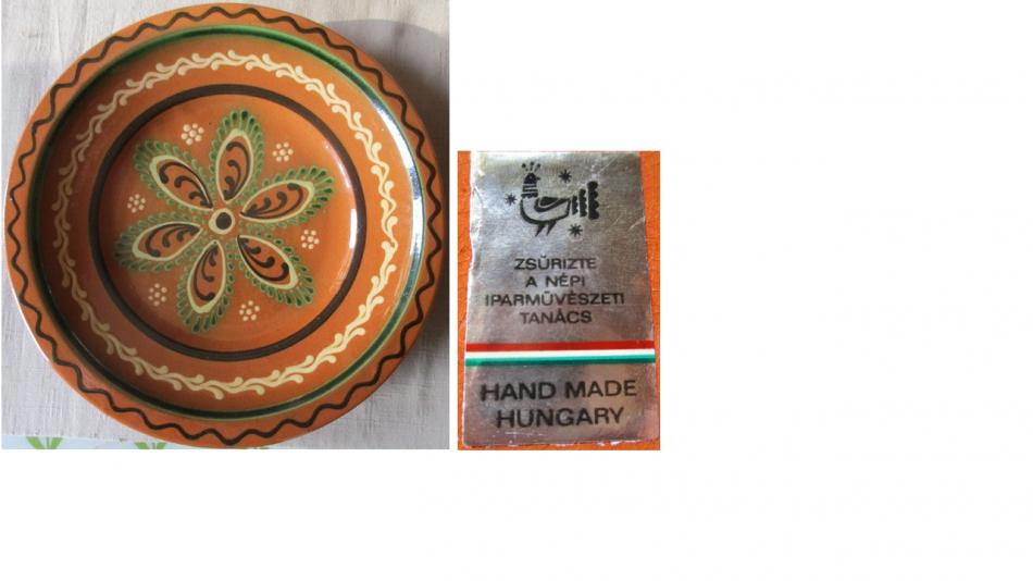 För dokumentation ett handgjort fat som är 21,5 cm Ø. Etikett med fågel (påfågel?) och tre stjärnor samt text ZSÜRIZTE A NÉPI IPARMÜVÉSZETI TANCAS.