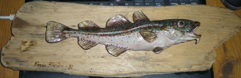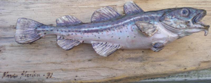 Har försökt få en bättre bild på signaturen, men den är otydlig i verkligheten och blir inte bättre på bild. Torsken är väldigt bra och detaljerat gjord så jag har svårt att tro att det är en vanlig amatör som gjort den.
