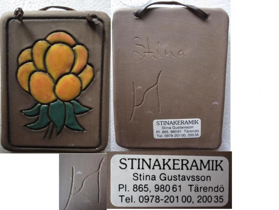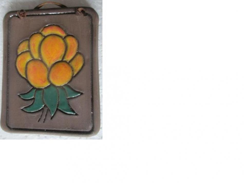 Ett moget hjortron på en väggplatta (10,5 x 8 cm) av Stina Gustavsson (f. 1936) och från Tärendö.