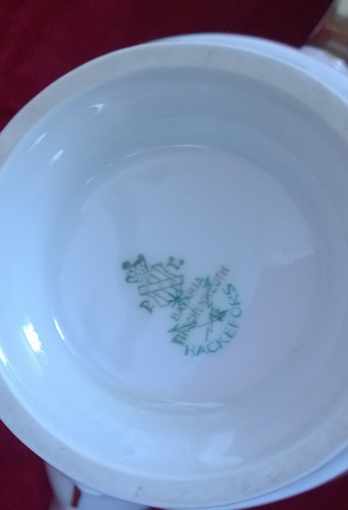 Jag har 3 delar av ett kaffeset Hackefors.Det är mkt vackert i designen tycker jag.Alla delar är i perfekt skick vilket är ganska otroligt då stämpeln anger att det bör vara porslin tillverkat mellan 1929-45.Det känns som folk förr tog bättre hand om sina saker,eller var de rädda att använda det kanske för det var för fint??