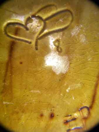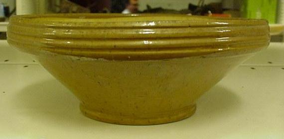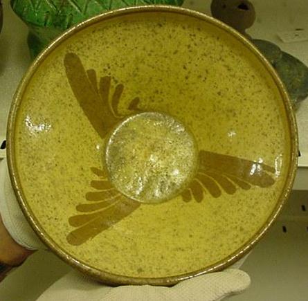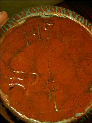 Fat, röd lera, 25 cm i diameter. Svärmor blev förtjust i den, hon kunde inte heller tyda signeringen. Får för mig att den ur från utlandet, denna gula glasyrsignering