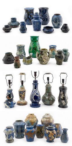 A collection arts and craft ceramic, comprising 19 vases, 6 table lamps, 4 lidvases, tablebowl, jardiniere and figure vase with handles in the shape of birds. 23 with hand signed monogram, 9 with stamped monogram. Manufactured by Møller & Bøgelys Keramiske Kunstbrænderi 1917-1920. (32)