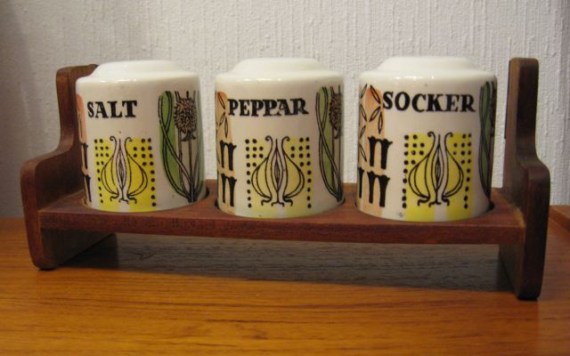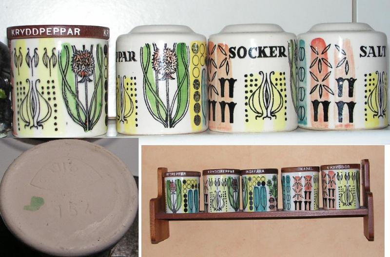 Har likadana burkar, mina är inte heller stämplade. Men jag har en likadan hylla men för fler burkar, de burkarna har lock av teak och texten i locket och de är alla djupstämplade enligt bilden,Jie Gantofta. Kolla på bilden och jämför så har de samma motiv. En av burkarna har en liten signatur i grönt, men det är det enda.