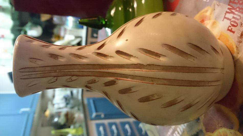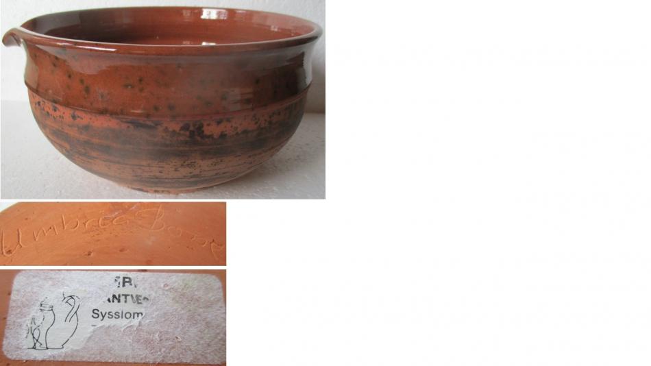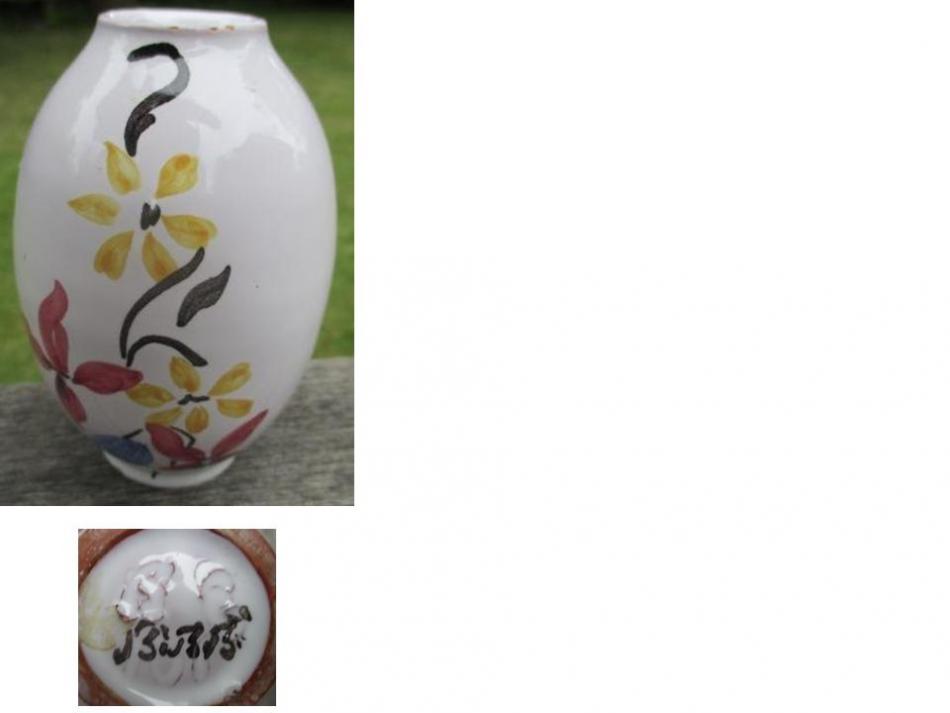 Med hjälp av uppgifter från Melker är det inte svårt att beskriva ett fat från Gamla Upsala keramikverkstad och där Karin Karlsson i sgraffitoteknik gjort kungsängsliljor. Folke Bolanders stämpel FB är lite otydlig men fullt läsbar. 13,5 cm Ø.