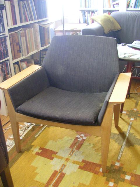 Någon som känner igen stolen? Har suttit 2 kvällar nu och googlat men inte hittat rätt, märkt med pappersetikett Danish Furniture Control och inköpspriset 510:-. Ni får bortse från dammet, den har stått på vinden många år men har nu tänkt använda den. Under dynan är det typ fiskelina draget som stöd.