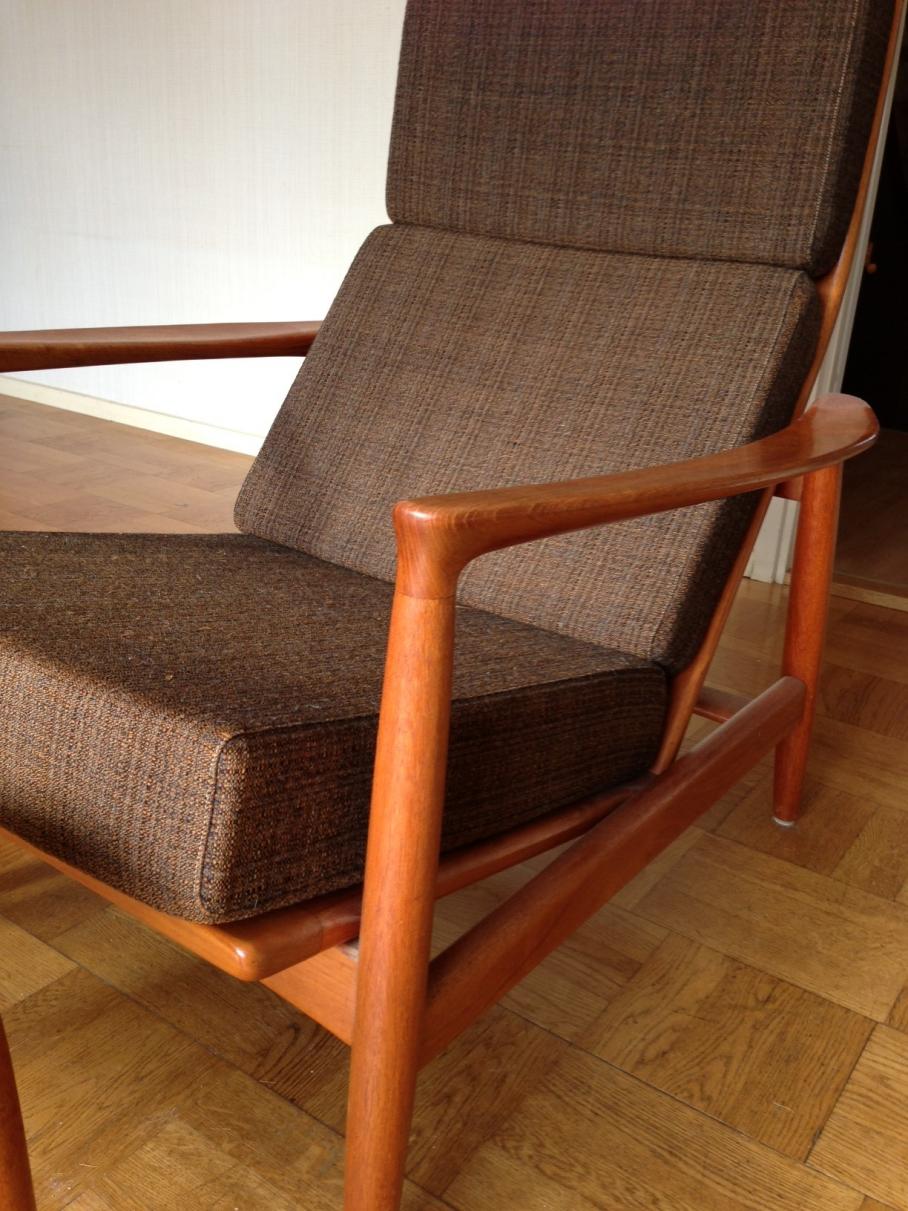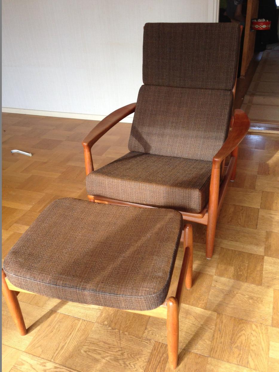 Jag har precis fått upp ögonen för skandinavisk design. Jag har ingen direkt kunskap men det har visat sig att jag uppskattar dem mycket. Jag har precis tagit över ett hus där ägaren lämnade kvar denna fåtölj med fotpall. Vet ni något mer om den? Någon formgivare kanske? Namn? Är tacksam för all hjälp.