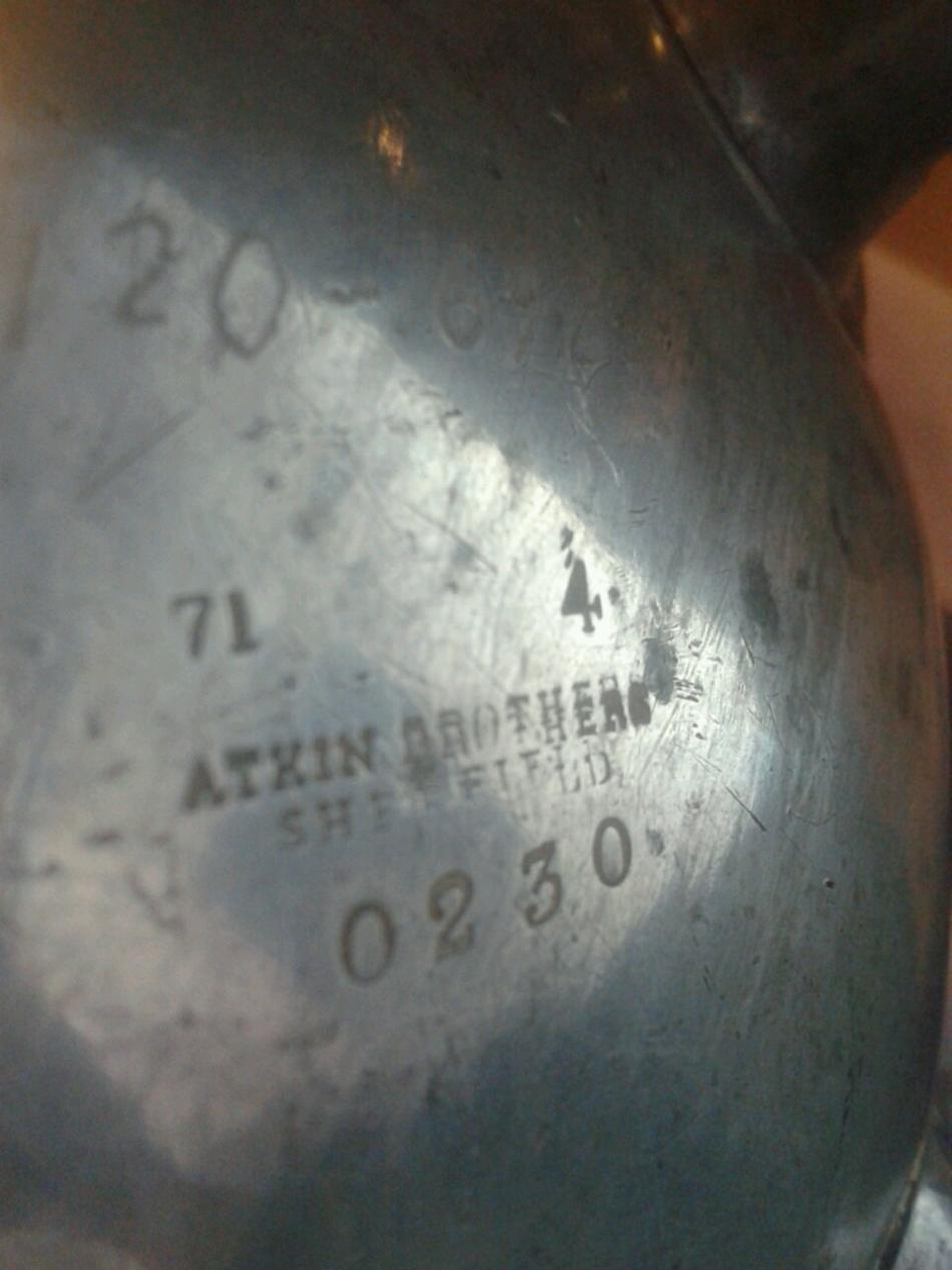 Nu när jag kom hem så upptäckte jag lite stämplar på undersidan. Det står att den är tillverkad av atkin brothers men jag fick inte fram något när jag googlade... Är det någon här som kan hjälpa mig? Jag skulle vilja veta vad den är gjord av, om den är "äkta" atkin brothers, hur gammal den är och alla andra fakta ni råkar innehava. (stämplar på undersidan är: atkin brothers, sheffield, 0230, sedan ovanför den texten är det två små stämplar, "71" och "4.", sedan finns det ett nummer inristat som lyder "200120-6925")