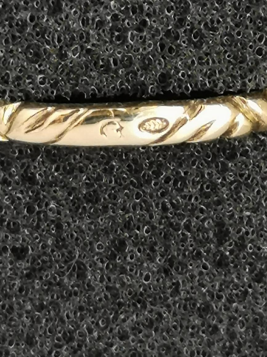 Till synes är den ena stämpeln är ett nederländsk eklöv 14K 1906-1953. Det som avviker från de bilder jag har hittat är att denna stämpel har en prick/punkt i höger nederkant. Punkten är klart en del av stämpeln. Jag hoppas att någon vet vad detta betyder.