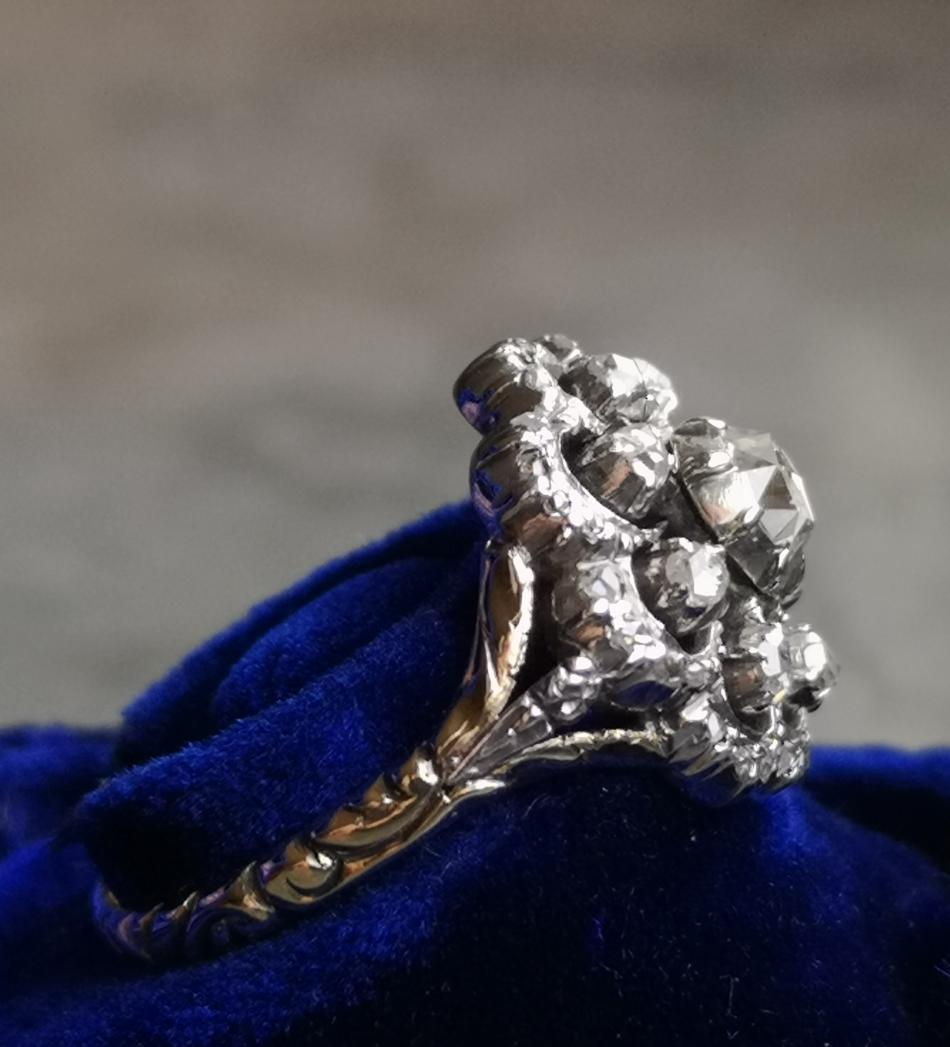 Det är en ring i georgiansk stil, guld, silver med rosenslipade diamanter.