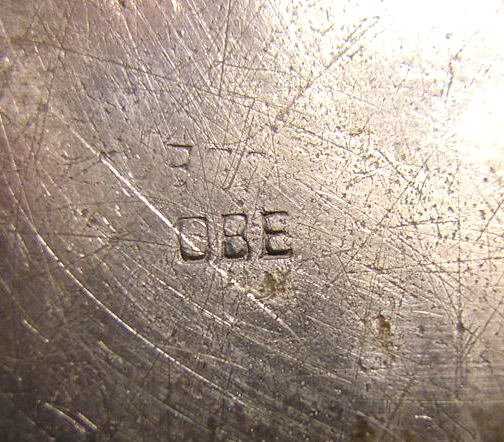 Visst är den läcker. Var kolsvart när jag började putsa. Trodde dold av oxid som den var att det var tenn men det nya silvret kom fram. Har sökt på alla möjliga sätt på OBE men hittar inget. Möjligen kan det vara en del av namnet eller betäckning på modell eller liknande. Förmodligen står firmans namn att finna i det som inte syns ovan OBE.
