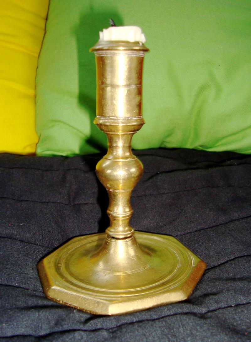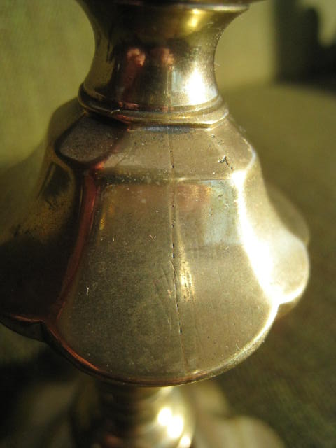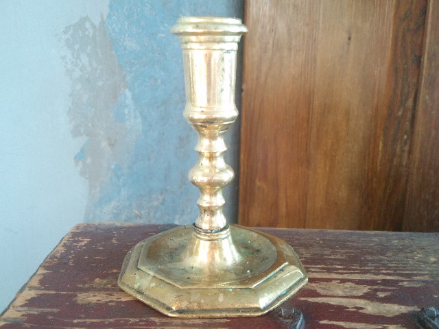 Tyvärr fanns det ju inte tillstymmelse till patina mer än lite på undersidan. I Sigurd Erixons Mässing: svenska manufakturer och konsthantverksprodukter under 400 år finns två snarlika med åttkantig fot och utifrån dessa borde denna modell vara från 1730-1740-talen.