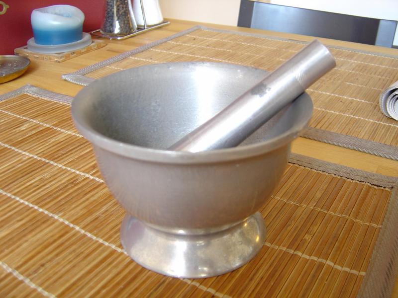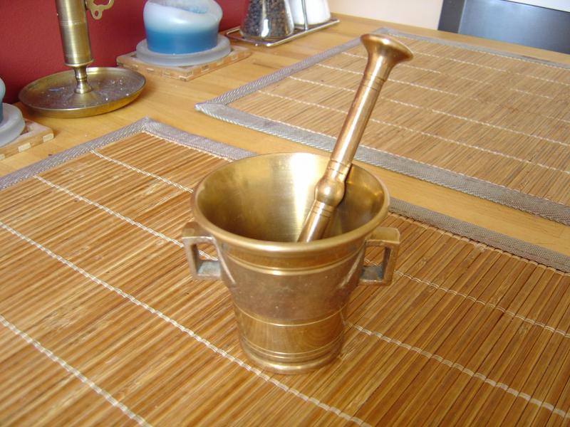 Den andra morteln är troligtvis driven i tenn. Jag hittar bara en slarvigt skriven märkning i botten men vet inte om det är en signatur.