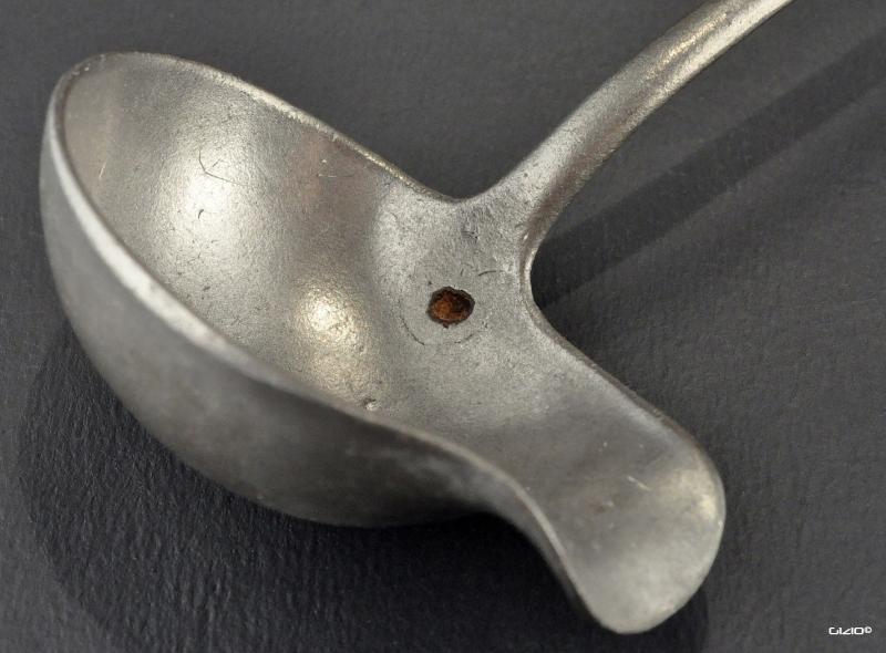 Jag har sett dessa slevar vid rätt så många tillfällen. Hade de varit i tenn, hade jag förmodligen köpt dem, men jag tror inte att de är i tenn. Jag har två alternativ på vad det är för material; Britannia-metall eller zink.