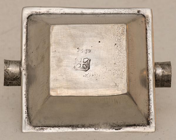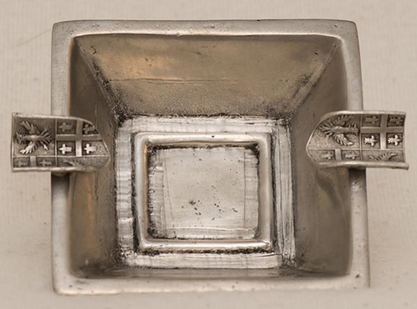 Jag antar att detta är en askkopp, materialet bör vara tenn. Utseendet är, för mig, minst sagt udda med örnar, liljor och en stämpel som ser ut som ett järnkors.