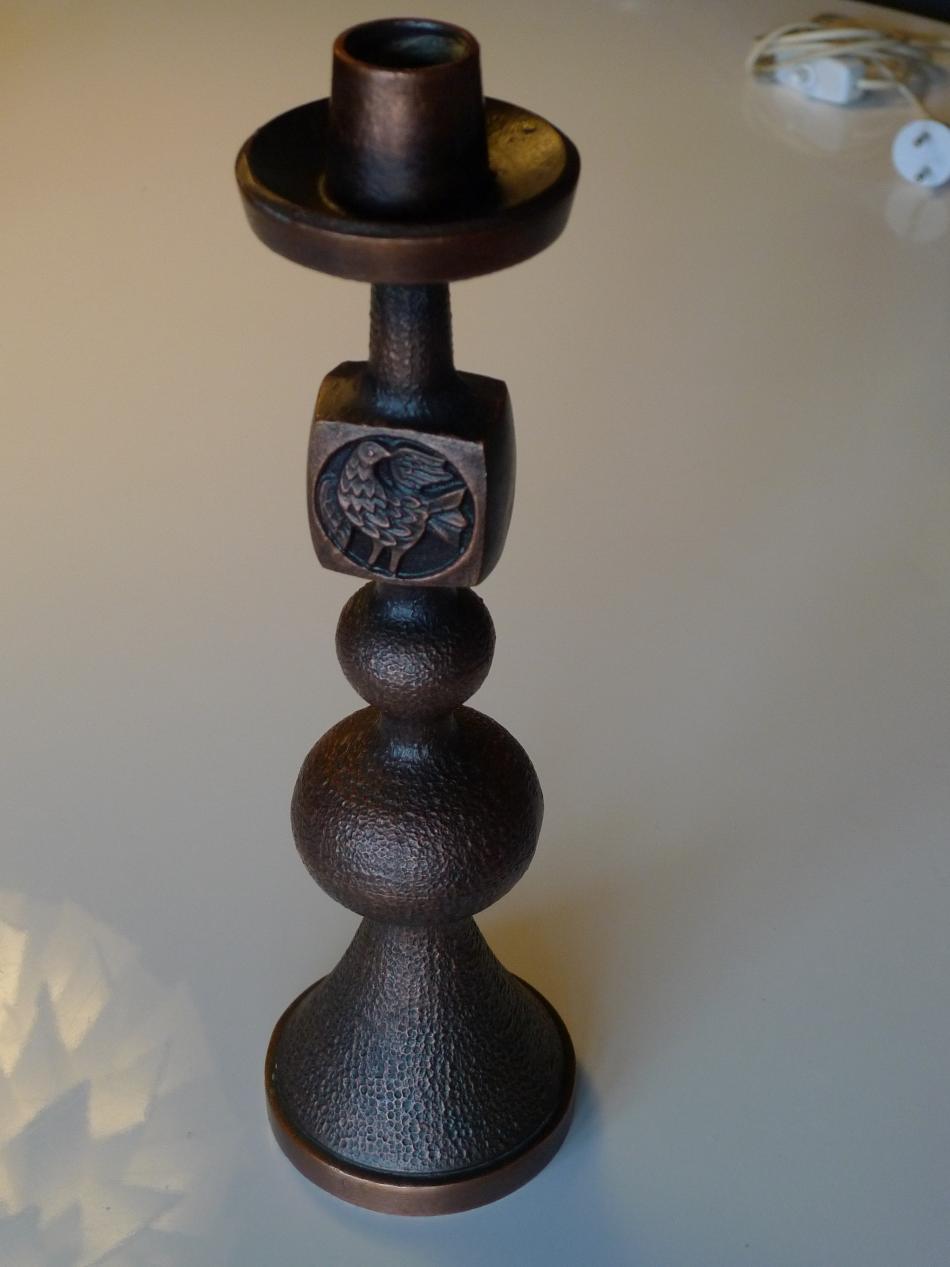 Ljusstake i koppar. Kub med motiv fågel på den ena sidan och en sol på den andra, 38 cm hög och 10 cm i diameter.