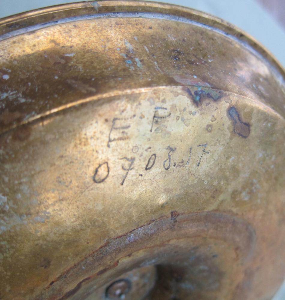 Mässing, tunn plåt, diameter 21 cm. Ägarsignatur EF 07 08 17. En antikvitet om en vecka.