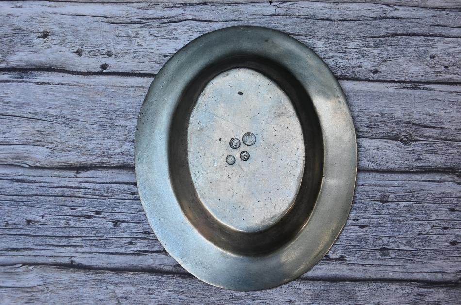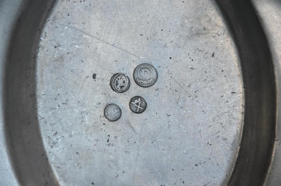 Det står Norge på den största; den ser inte ut att vara från 1768 så jag tror det är en 1900-talsprodukt i gammal stil. De andra stämplarna är i gammal stil eller kanske kopior efter gamla stämplar. Stämpel med ett krönt X användes förr i åtminstone Tyskland som beteckning på en tennkvalitet (10 delar tenn och 1 del bly har jag för mig).
