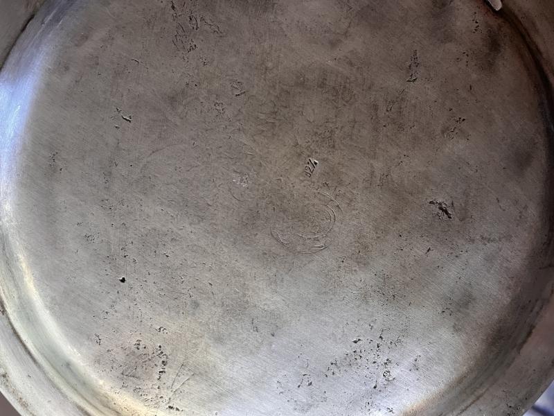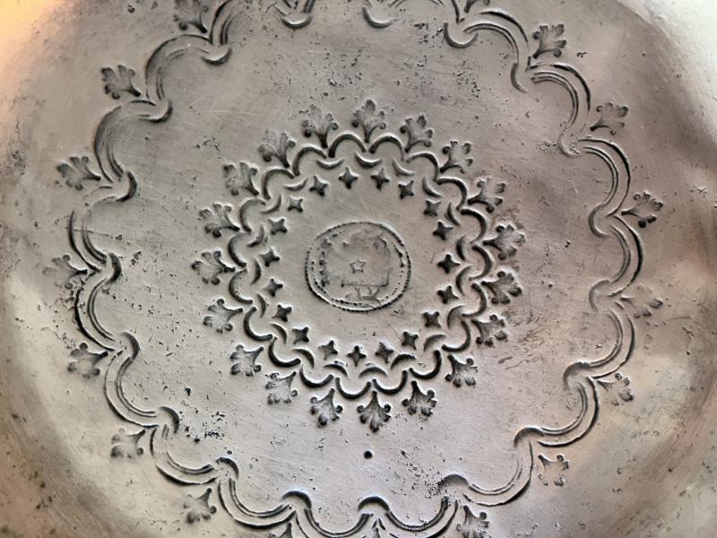 Jag har inte sett sån här dekor förut, antikt tenn kan ha gravyr men detta är snarare stämplar eller punsar, eller möjligen gjort direkt i gjutningen. Det är nog gjort nånstans på kontinenten, kanske Östeuropa för det verkar inte efterlikna något västeuropeiskt tenn jag sett.