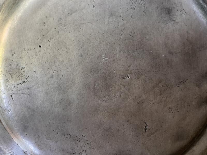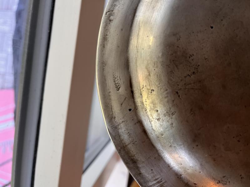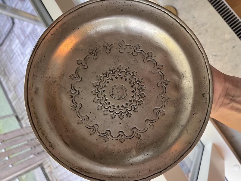 Det rör sig om ett prydnadsfat som är max 50-60 år gammalt (att stämpla med tennhalt i procent är ett sentida påfund).