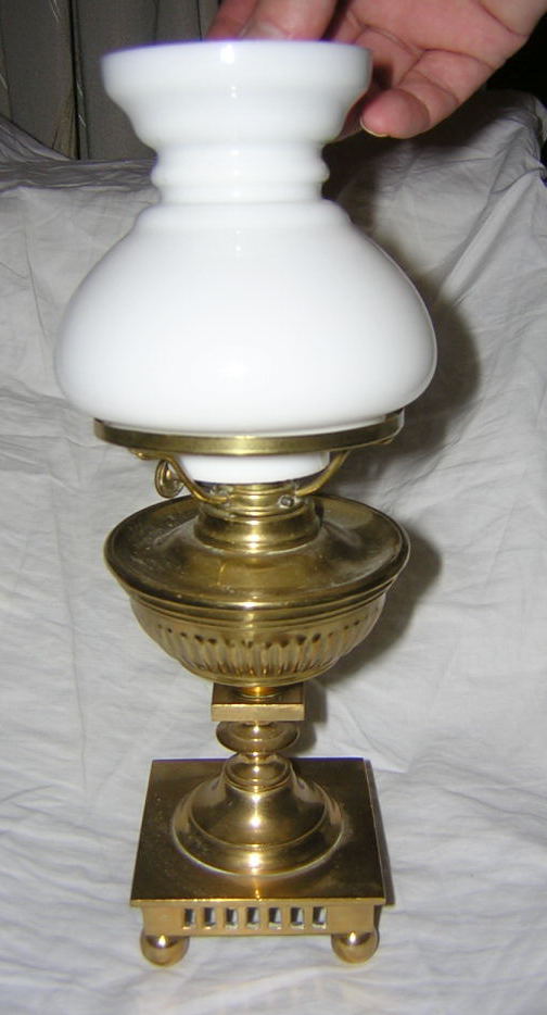 Dagens auktion blev tämligen lyckad. Bl.a köpte jag denna lilla fotogenlampa märkt Skultuna no 150 1611. Höjden på själva lampan är bara 15 cm. Kupan tillkommer. No 150 står för Skultunas gallerserie. Har aldrig sett denna storlek på fotogenlampa från Skultuna tidigare. Övriga Gallerserien är ganska basanta saker varför jag tror att det är en minimodell som tillverkats. Har inte hunnit söka på nätet utan hoppas någon vet mer om denna lampa. Ena fästet är löst varför min fru fick hålla kupan på plats. Om kupan är orginal vet jag inte.
