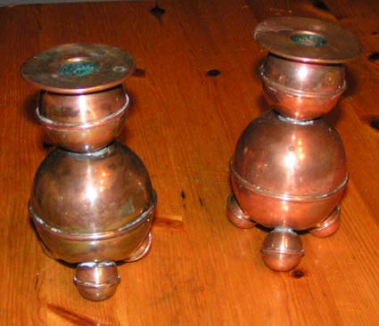 Gusums Mässingsbruk tillverkade i slutet på 1800-talet och en bit inpå 1900-talet något som brukar kallas kulserien. I den ingick en massa olika föremål som alla var uppbyggda som kulor. Vissa delar gick naturligtvis inte att göra i kulform. Alla delar gjordes dock med kulfötter. Många andra tillverkare hakade naturligtvis på och gjorde egna varianter med kulor. Dina dubbelstakar är inte Gusum utan tillverkade av någon annan. Gusums skarvar var inte synliga men finns där. Dina stakar är gjorda i två halvor som pressats samman. Fyllda med något, gips eller annat för att få tyngd. Ser ut som koppar men kan vara någon mässingslegering som gör dom lite kopparlika. Kan stå Eriksson eller Carlsson i botten på dina men förmodligen omärkta eftersom du inget skriver om detta. Värdet är inte så stort, några hundralappar. Blev mycket dökött men hade lite skrivklåda.