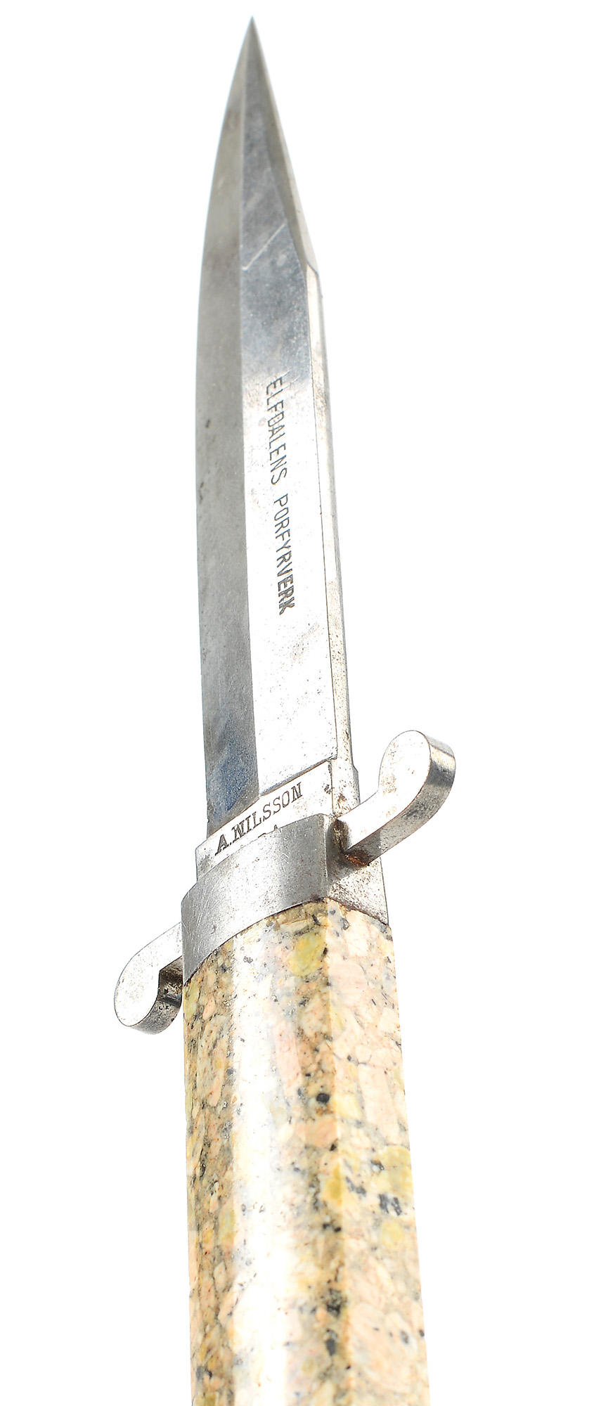 Glömde skriva att kniven är tillverkad i Älvdalens porfyrverk.