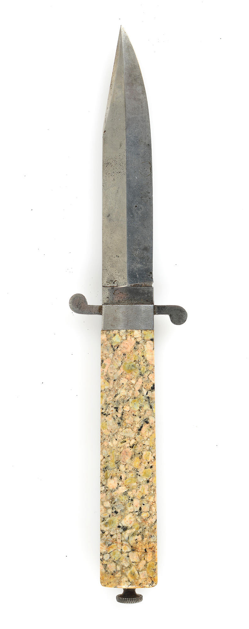 Jag har sett ganska många knivar,dolkar, svärd osv... genom åren med porfyrskaft från älvdalen, men inget som liknar detta.