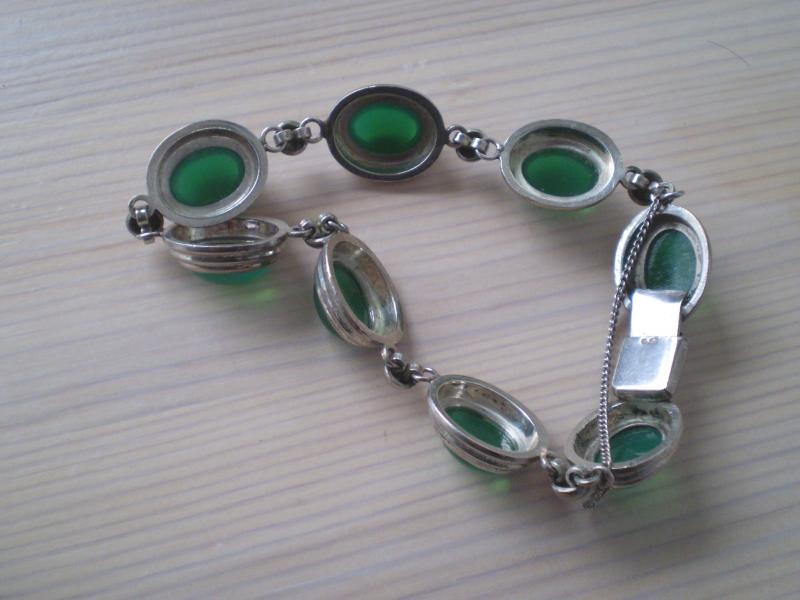 Armbandet stämplat med oval stämpel med tre kronor, vilket är den svenska importstämpeln och S står för silver. Här rör det sig alltså om minst 830/1000-delar rent silver. Förmodligen köpt i Sverige eftersom den är importstämplad och tillverkad i utlandet.