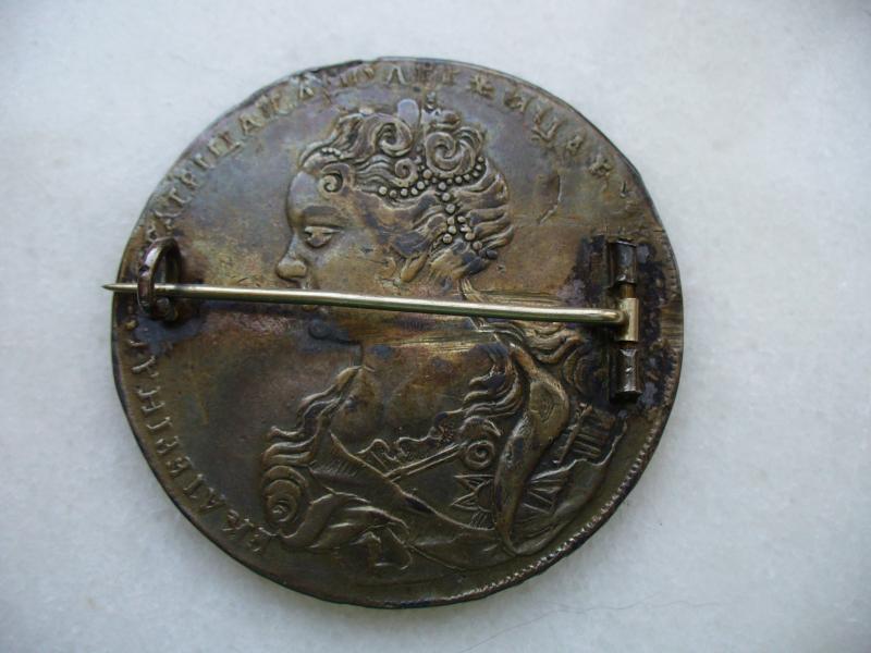 Det ser ut som ett mynt, men med en nål bakom. Vad jag hittat på nätet är "trycket" från ett ryskt mynt "Russia Catherine I POLTINA Ruble", vilket är en halv ruble om jag förstått rätt.. Det jag inte förstår är varför den där nålen sitter fast bakom..