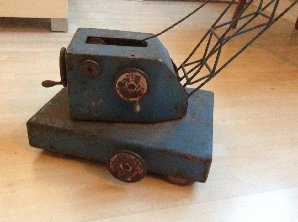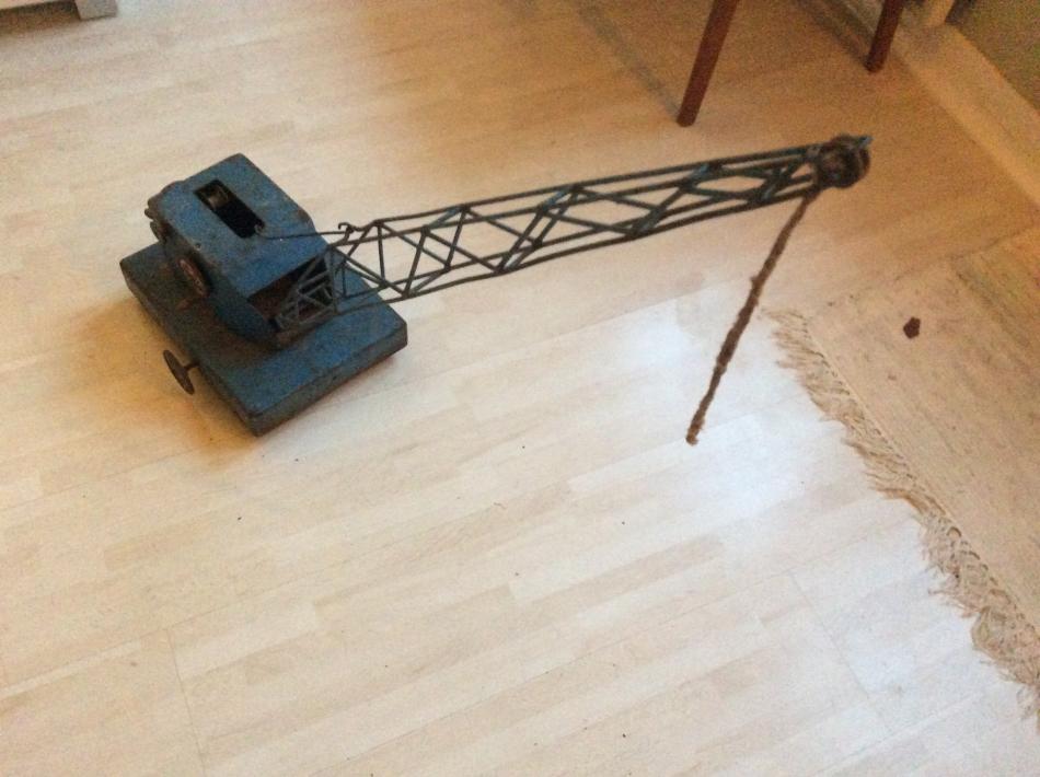 Någon som vet något om denna leksakskran? Jag återupptäckte den nyss på vinden. Den kom till huset på 70-talet och redan då förmodades den vara väldigt gammal. Stor är den. Bara armen på kranen är cirka 75 cm lång. Det syns rester av ett gammalt märke på "karossen" men det går inte att läsa längre. Någon som vet något eller har en kvalificerad gissning?
