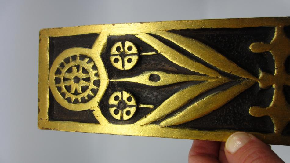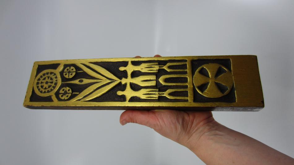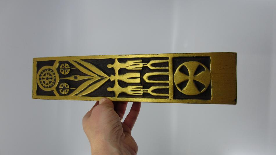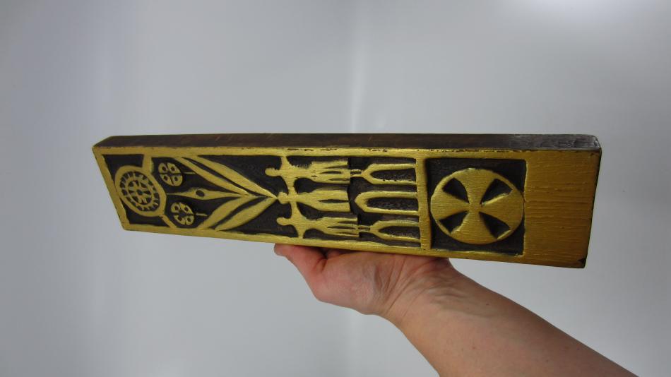 Ristad träplanka med hedniska / fornnordiska / sci fi symboler - någon sorts vapen?