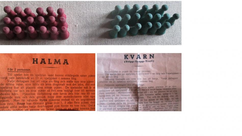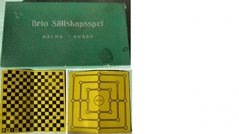 Från BRIO kommer en låda med två spel: HALMA och KVARN. Pjäserna är av trä och skall vara 19 + 19 st men det saknas en lila. (Jag får väl tälja en joker av en pinne - eller heter det wildcard numera?) Spelplan: 18,5 x 18,5 cm. Mer om Halma här https://sv.wikipedia.org/wiki/Halma och kvarnen maler väl på annat ställe? När gjorde BRIO sådana spel?