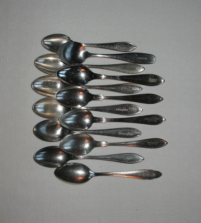 Notera nogsamt att en av skedarna sticker ut. Alla de övriga är i svensk (spetsig) modell, men en är Servus (Sigurd Persson) och typiskt nog är den märkt med Konsum.Ursprungligen postat av Jung_Kee Visa inläggHittade en "minisamling" av märkta skedar, som jag har köpt färdig som den är märk väl, som på något sätt är införskaffade ifrån hotell och restauranger lite häråvarstans ifrån...